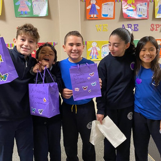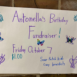 The 4th grade class at St. Hugo's put on a fundraiser to support the AI Memorial Foundation and honor Antonella's birthday. They decorated purple bags with butterflies and made signs to promote their event throughout the school. They sold candy and AI Memorial Foundation bracelets.